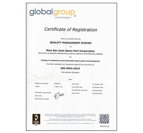 Nam Bắc đã đạt chứng nhận hệ thống quản lý chất lượng tiêu chuẩn quốc tế ISO 9001:2015, với tinh thần hòa nhập Quốc tế - phát triển bền vững, Ban lãnh đạo CÔNG TY CỔ PHẦN PHỤ TÙNG Ô TÔ NAM BẮC cam kết mang đến cho khách hàng: